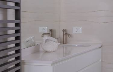 La zona notte ospita una spaziosa camera matrimoniale e una seconda camera che può essere utilizzata come studio o camera ospiti. Entrambe sono servite da due bagni completi e finestrati, con ampio idromassaggio, di raffinato design contemporaneo. La distribuzione degli spazi risulta estremamente funzionale per confort e privacy, includendo una cabina armadio, un ripostiglio e una comoda lavanderia separata.