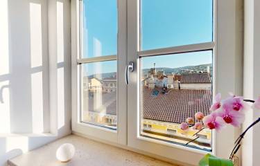L’ingresso introduce a una scenografica zona living, dove le numerose superfici finestrate regalano una luminosità naturale straordinaria durante tutto l’arco della giornata. Le viste, aperte e suggestive, spaziano sui tetti della città e sulla corona di colli circostanti offrendo rari scorci sul mare, per una sensazione di respiro, luce e assoluto privilegio.